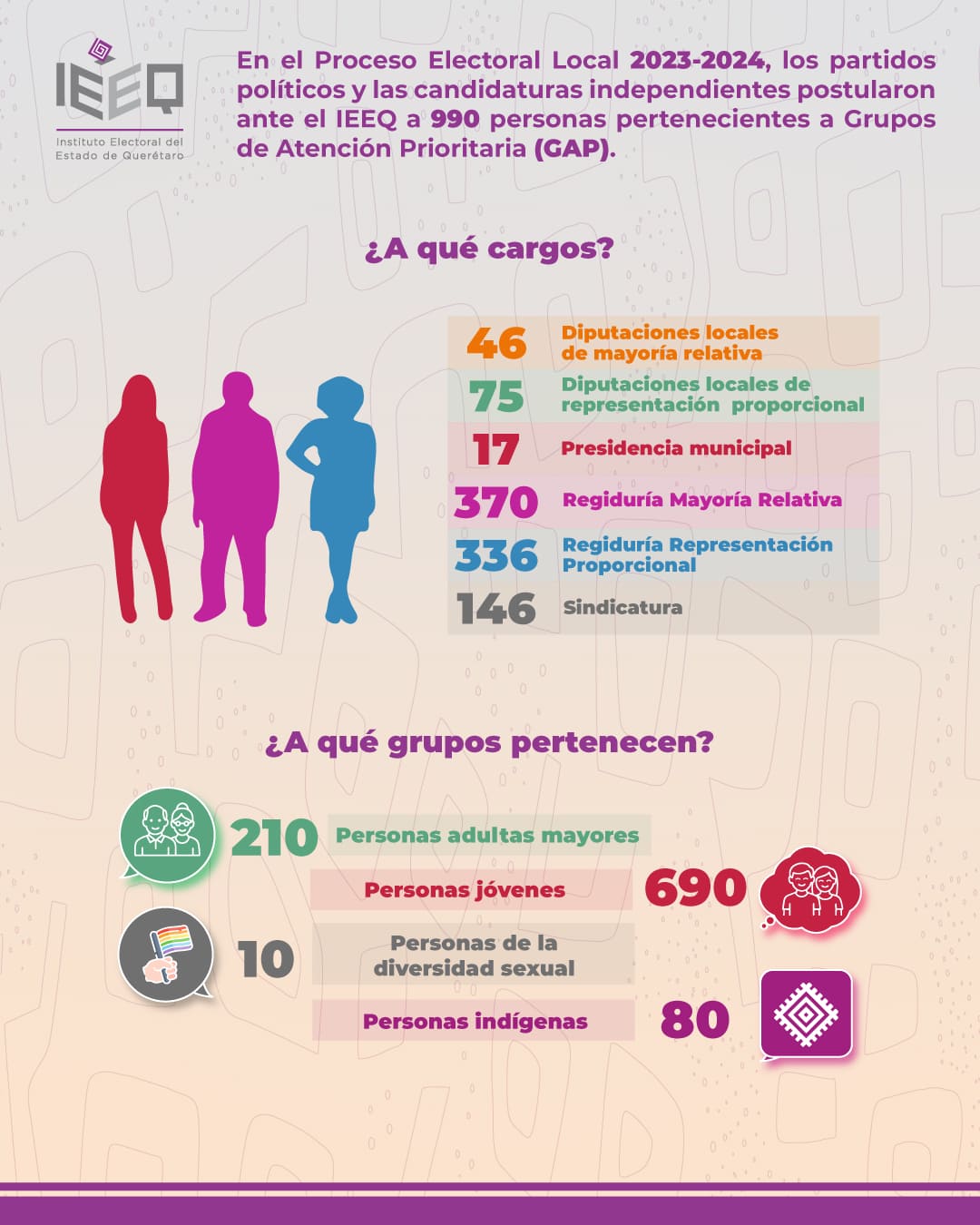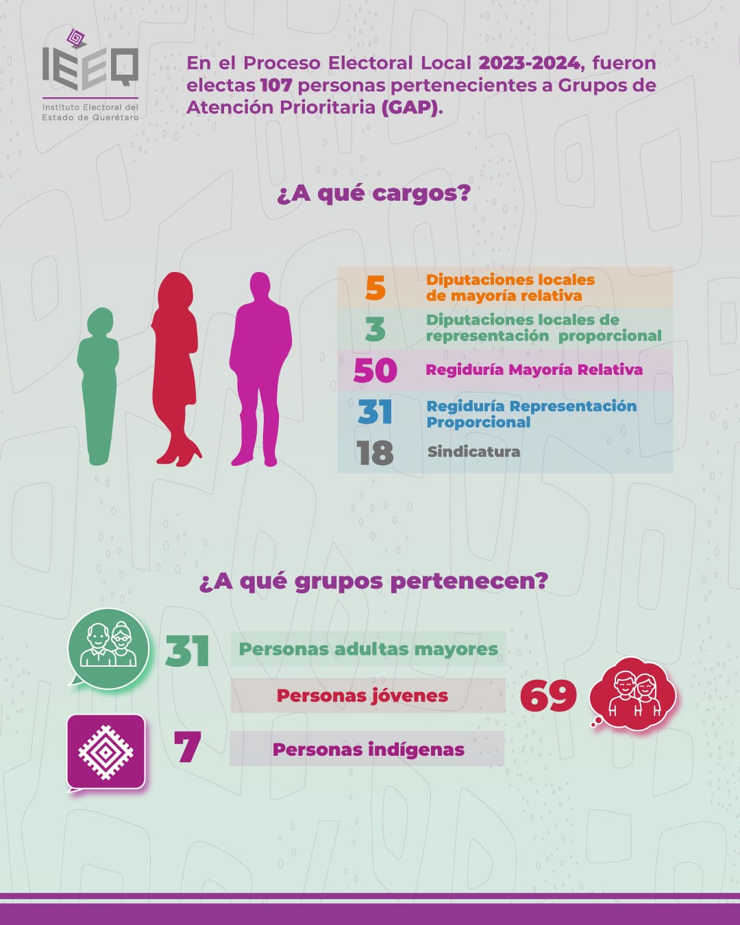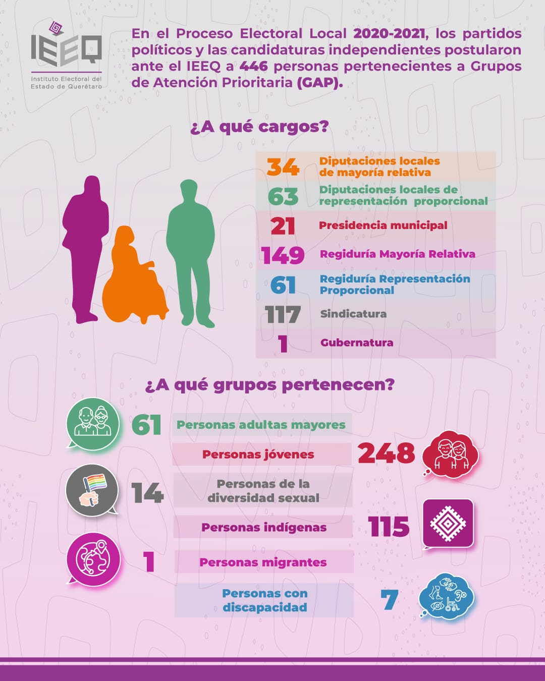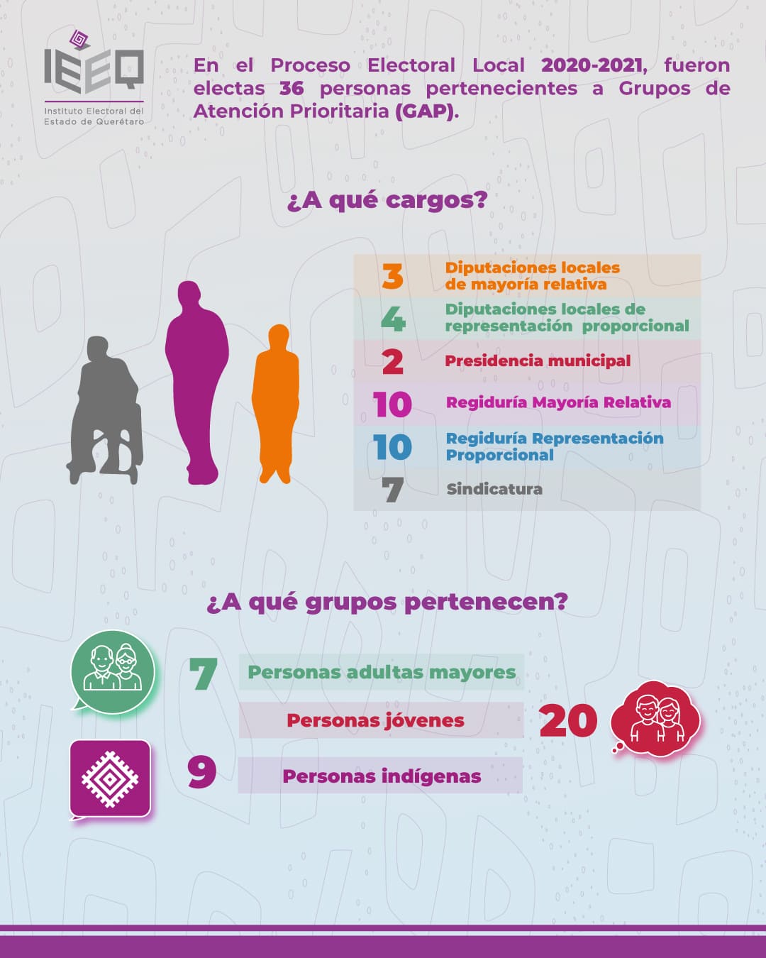 - Fórmula indígena de género masculino: Integrada por una persona propietaria del género masculino, en cuyo caso, la persona suplente podía ser de género femenino o masculino. Dicha fórmula sería utilizada, en su caso, para asignar una curul a la representación indígena en la conformación final de la Legislatura Estatal, en términos de la Ley Electoral y los Lineamientos del IEEQ.